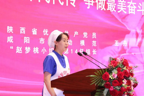 “趙夢桃小組”歷任組長也來到大會現(xiàn)場。為表達對老組長們的敬意與愛戴之情,“趙夢桃小組”現(xiàn)任組長王丹帶領(lǐng)她的姐妹們,精心準(zhǔn)備了鮮花獻給趙夢桃小組第3任組長王西京、第5任組長王廣玲、第7任組長韓玉梅、第8任組長劉育玲、第9任組長徐保鳳、第10任組長周惠芝、第11任組長劉小萍、第12任組長王曉榮、第13任組長何菲。