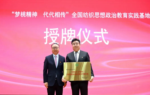 一束束鮮花凝聚了一代代“夢桃小組”成員的濃濃戰(zhàn)友情、姐妹情,“夢桃精神”將她們的心緊密連接在一起,“趙夢桃小組”成員始終以趙夢桃同志為榜樣,在工作上勇于創(chuàng)新、甘于奉獻、精益求精,爭做新時代的最美奮斗者,把夢桃精神一代一代傳下去。  十位全國勞模代表楊普、毛玉剛、謝秀榮、李承霞、王筆仙、姜玲、劉莎、何東升、黃云娜、范冬云上臺,與趙夢桃小組成員合影留念。  隨后,“趙夢桃小組”全體成員舉起右手莊嚴(yán)宣誓,始終堅守“夢桃精神”不掉色,牢記習(xí)近平總書記對“趙夢桃小組”的勉勵,繼續(xù)以趙夢桃同志為榜樣,在工作上勇于創(chuàng)新、甘于奉獻、精益求精,爭做新時代的最美奮斗者,把夢桃精神一代一代傳下去。  為了在新時代更好研究、傳承和弘揚好夢桃精神,中國紡織工業(yè)聯(lián)合會決定在咸陽紡織集團有限公司建立“夢桃精神代代相傳”全國紡織思想政治教育實踐基地。中國紡聯(lián)希望咸陽紡織集團在弘揚傳承夢桃精神的新征途中,保護好、研究好、利用好、傳承好“夢桃精神”,進一步挖掘夢桃精神文化因素和新時代內(nèi)涵,打造思想和文化建設(shè)新高地。為更好傳承“趙夢桃小組”優(yōu)良傳統(tǒng),弘揚新時代勞模精神、勞動精神、工匠精神、創(chuàng)新精神,凝聚全國紡織行業(yè)創(chuàng)新力量,夯實紡織強國根基,助推全國紡織服裝產(chǎn)業(yè)邁向高質(zhì)量發(fā)展。中國紡聯(lián)黨委辦公室主任、中國紡織職工思想政治工作研究會會長邢冠蕾宣讀設(shè)立基地《決定》。