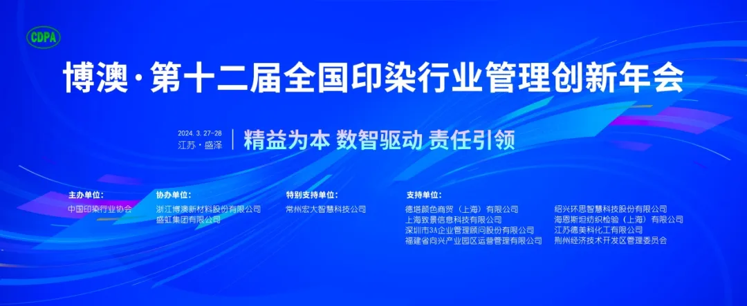 3月27日,博澳·第十二屆全國印染行業管理創新年會在江蘇省盛澤鎮成功召開。大會以“精益為本 數智驅動 責任引領”為主題,圍繞精益生產管理、數字化智能化管理、可持續性未來構建等議題進行經驗交流。