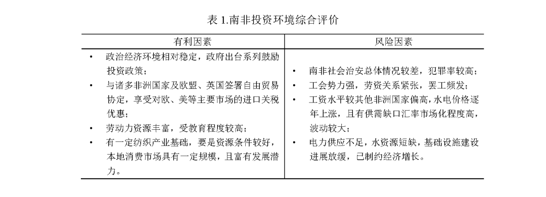 (1)南非作為撒哈拉以南的主要經(jīng)濟(jì)體,與中國(guó)建立了長(zhǎng)期友好合作關(guān)系,是第一個(gè)同中國(guó)簽署共建“一帶一路”合作文件的非洲國(guó)家,也是中國(guó)在非洲投資存量最多的國(guó)家之一,因其工業(yè)基礎(chǔ)良好、硬件基礎(chǔ)設(shè)施相對(duì)完備、海運(yùn)便利,對(duì)外貿(mào)易與投資優(yōu)惠政策具有吸引力,紡織服裝業(yè)成為其吸引外資的重點(diǎn)行業(yè)。