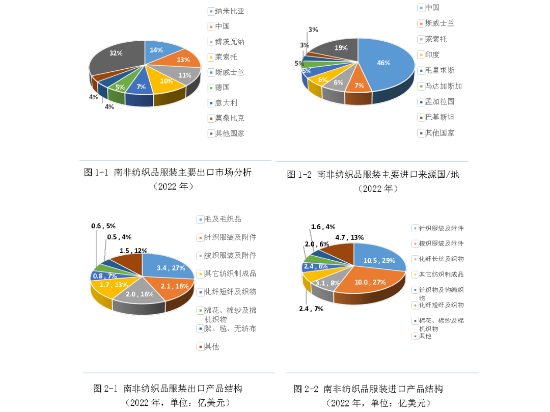 (3)目前,南非國(guó)內(nèi)紡織服裝產(chǎn)能仍顯不足,半數(shù)以上的紡織品服裝從國(guó)際市場(chǎng)采購(gòu)。中國(guó)是南非最大的紡織品服裝進(jìn)口來(lái)源國(guó),中國(guó)—南非“經(jīng)認(rèn)證的經(jīng)營(yíng)者”(AEO)互認(rèn)于2023年9月1日正式實(shí)施,兩國(guó)在貿(mào)易往來(lái)上享受通關(guān)便利。