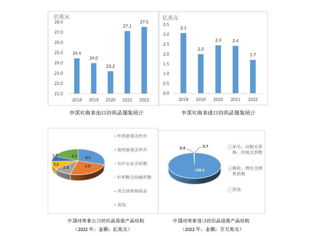 中南兩國(guó)經(jīng)貿(mào)合作歷史悠久,中國(guó)連續(xù)14年穩(wěn)居南非第一大貿(mào)易伙伴國(guó),同時(shí)也是南非第一大紡織品服裝進(jìn)口來(lái)源國(guó),南非則連續(xù)13年成為中國(guó)在非洲最大貿(mào)易伙伴。據(jù)中國(guó)海關(guān)統(tǒng)計(jì),2022年,中國(guó)與南非紡織品服裝進(jìn)出口貿(mào)易總額為29.2億美元,其中出口額27.5億美元,進(jìn)口額1.7億美元。中國(guó)自南非進(jìn)口的紡織產(chǎn)品99.4%為羊毛原料及羊毛紗線、織物。中國(guó)紡織業(yè)對(duì)南非出口以服裝為主,出口額為15億美元,占中國(guó)對(duì)南非紡織品服裝出口總額的比重達(dá)54.4%,其次是化纖長(zhǎng)絲及織物(占比10.3%)、針織物及鉤編織物(占比9.5%)。