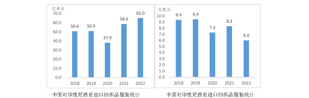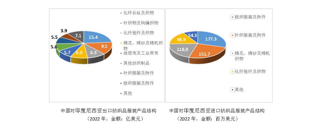 作為東盟最大經濟體,印度尼西亞是中國企業海外投資特別是對“一帶一路”沿線國家投資的重要目的地國,也是“21世紀海上絲綢之路”的重要地理樞紐。據中國海關統計,2022年中國與印度尼西亞紡織品服裝進出口總額為71億美元,其中出口額65億美元,進口額6億美元。中國紡織業對馬來西亞主要出口產品包括化纖長絲及織物(占比23.6%),針織物(占比14.7%),化纖短纖及織物(占比9.6%)以及棉花、棉紗及棉機織物(占比9.2%)等;主要進口產品為梭織服裝及附件(占比29.5%),針織服裝及附件(占比25.2%),棉花、棉紗及棉機織物(占比19.8%)以及化纖短纖及織物(占比16.5%)等。