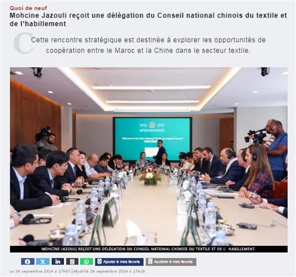在兩國各領域深化合作持續推進的背景下,由中國紡織工業聯合會副會長、中國國際貿易促進委員會紡織行業分會會長徐迎新率領的23人紡織服裝企業家代表團于2024年9月24-30日訪問非洲之行的第二站——摩洛哥。中國紡織工業聯合會副會長端小平、中國麻紡織行業協會會長董春興、中國印染行業協會監事長陳志華、中國棉紡織行業協會、中國化學纖維工業協會、中國服裝協會相關領導、蘭西天纖坊亞麻有限公司、魯泰紡織股份有限公司、遠信工業股份有限公司、杭州觀晨實業有限公司、浙江錦馬自動化科技有限公司、浙江金彩新材料有限公司、新德集團有限公司、江蘇新瑞貝生物科技股份有限公司、天希進出口貿易(廣州)有限公司等企業的企業家及高管隨訪。