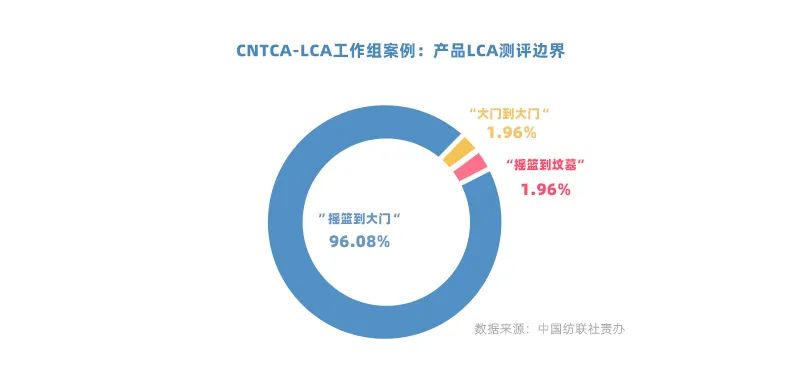 根據(jù)CNTAC-LCA工作組統(tǒng)計,目前絕大部分(96.08%)產(chǎn)品的測評邊界為“搖籃到大門(Cradle-to-Gate)”,對于紡織品即從“纖維到成品”,1.96%的產(chǎn)品測評邊界為“搖籃到墳墓(Cradle-to-Grave)”,1.96%的產(chǎn)品測評邊界為“大門到大門(Gate-to-Gate)”。