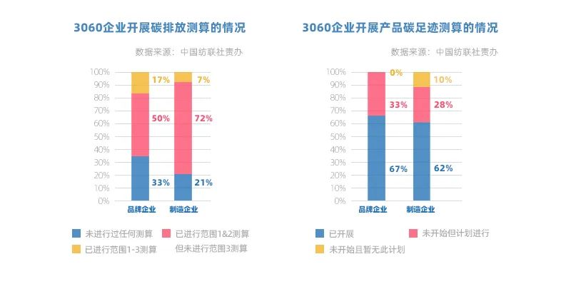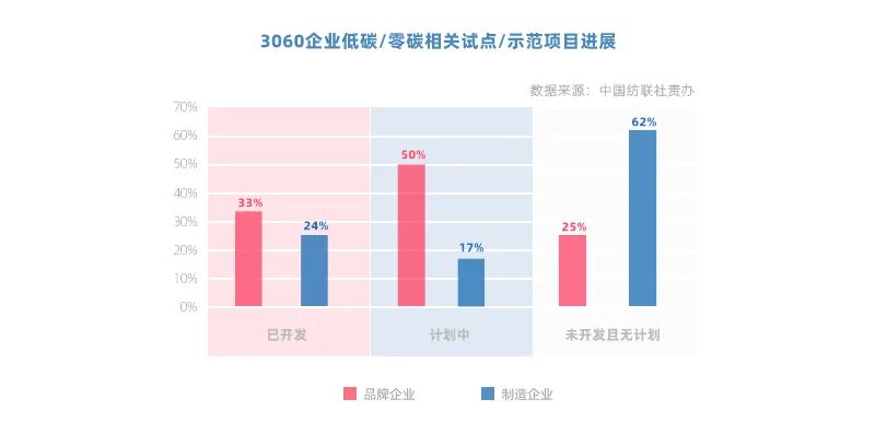 隨著國家推動并建立綠色低碳相關工廠與產(chǎn)品等評價方法,紡織企業(yè)積極響應,錨定產(chǎn)業(yè)轉型新機遇,3060企業(yè)已有27%完成開發(fā)低碳/零碳相關試點/示范項目。