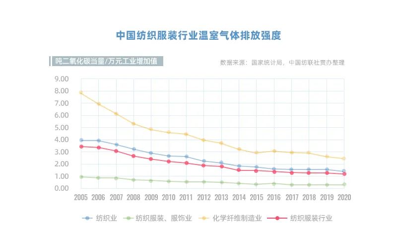 02 行業(yè)氣候行動進展 中國紡織服裝行業(yè)年排放量大約在2.3億噸左右,2020年排放總量約為2.09億噸。行業(yè)排放量約占全國排放量的2%,占全國工業(yè)排放量的2.8%,因此與其他行業(yè)相比,紡織服裝行業(yè)整體排放水平不高。而根據(jù)國際能源署統(tǒng)計,2019年全球紡織和皮革業(yè)排放在2.99億噸左右,占全球排放量的0.6%,因此,中國作為全球紡織服裝產(chǎn)業(yè)和消費大國,中國紡織服裝行業(yè)肩負重大使命,其氣候行動和進展將極大推動全球時尚行業(yè)綠色轉型。