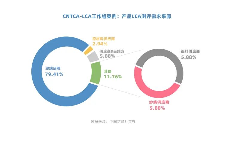 CNTAC-LCA工作組案例顯示,終端品牌是產(chǎn)品碳足跡測評的主要推動者。79.41%的測評需求來源于品牌,2.94%來源于原材料供應商,11.76%來源于紗線、面料等中間產(chǎn)品供應商,還有剩余5.88%的測評由供應商和品牌方合作發(fā)起。