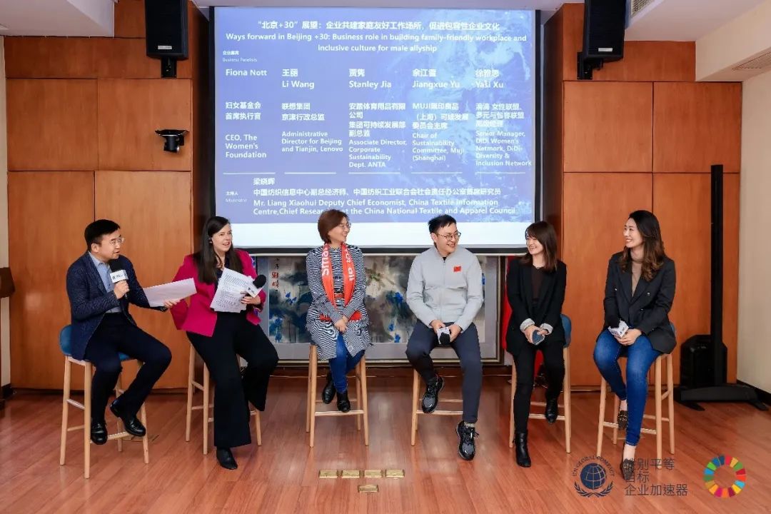 在 [展望“北京+30”:企業(yè)共建家庭友好工作場(chǎng)所,促進(jìn)包容性企業(yè)文化]企業(yè)圓桌論壇中,梁曉暉博士擔(dān)任主持人,與來(lái)自安踏、滴滴、聯(lián)想、無(wú)印良品和婦女基金會(huì)的代表共同討論建設(shè)家庭友好企業(yè)的成果和挑戰(zhàn)。