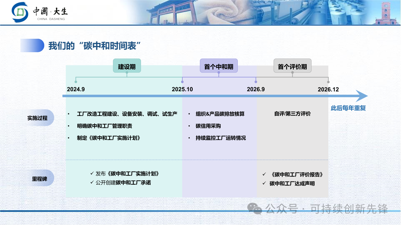 根據《T/CNTAC 187—2023〈紡織行業碳中和工廠創建和評價技術規范〉》,大生集團制定了詳細的碳中和實施計劃:將全面盤查工廠溫室氣體排放,推進節能技改、分布式光伏建設、儲能電站投用及綠電采購等項目,對無法通過技術手段消除的剩余排放實施碳抵消,最終實現工廠運營范圍內的碳中和。