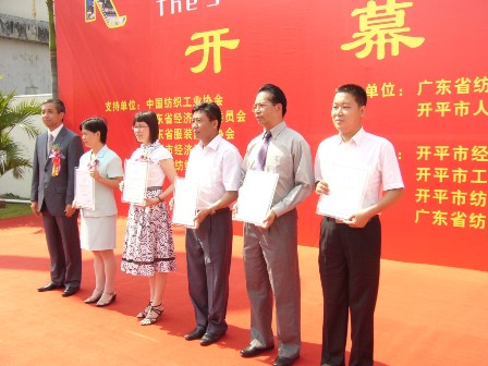 2008年10月17日,第五屆中國(開平)牛仔服裝節(jié)開幕式上,陳樹津副會長代表中國紡織工業(yè)協(xié)會為開平春暉股份有限公司、開平奔達紡織有限公司、開平富琳紡織制衣有限公司、開平平豐紡織有限公司和開平市英協(xié)制衣廠有限