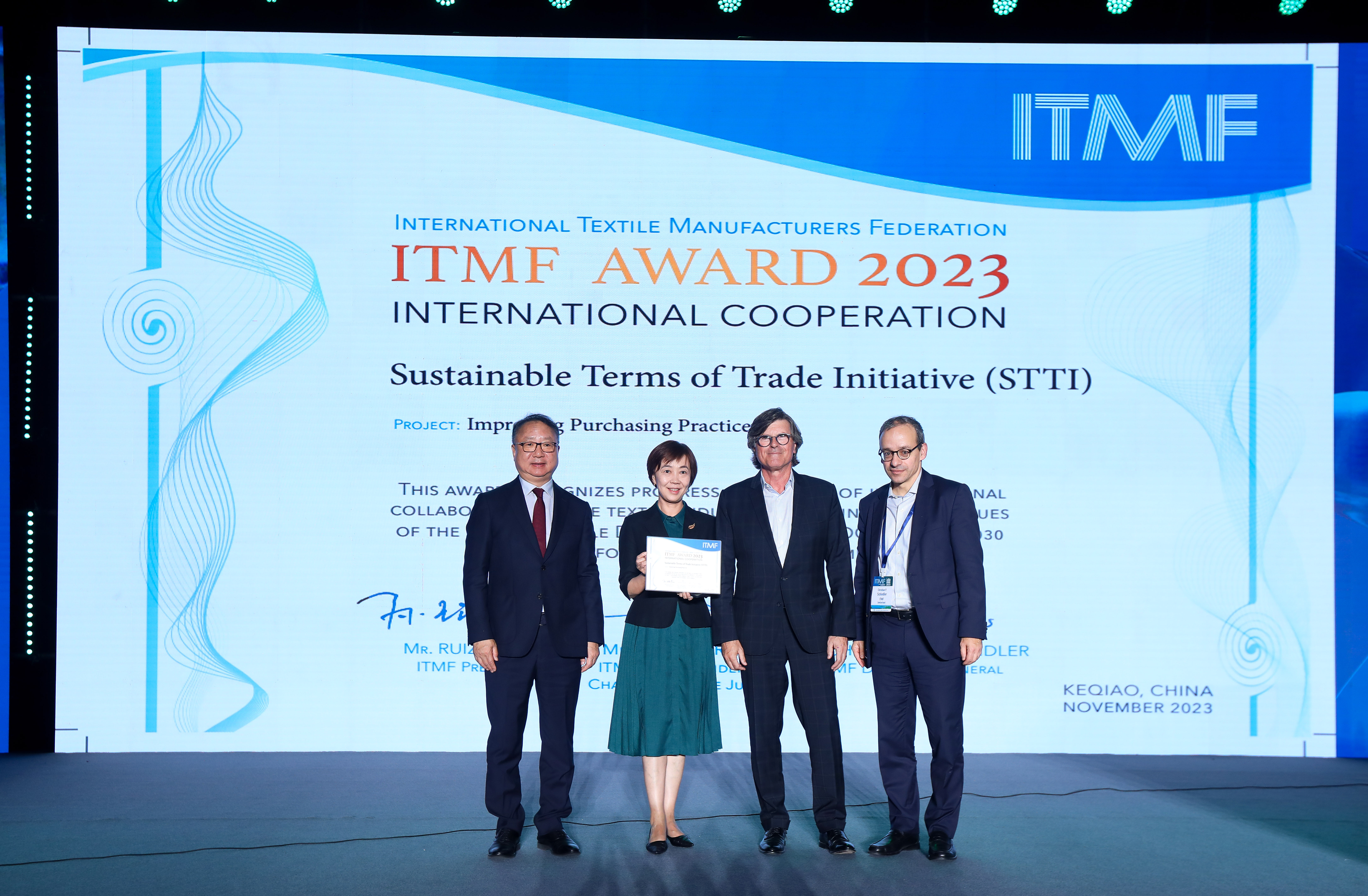 由中國紡聯首倡并已有11個國家的15個行業組織加入的“可持續貿易條款倡議”(STTI)榮獲2023年度國際紡聯國際合作獎。
